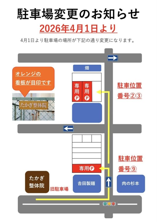 “たかぎ整体院”と書かれているオレンジ色のボードの場所をご利用ください。
